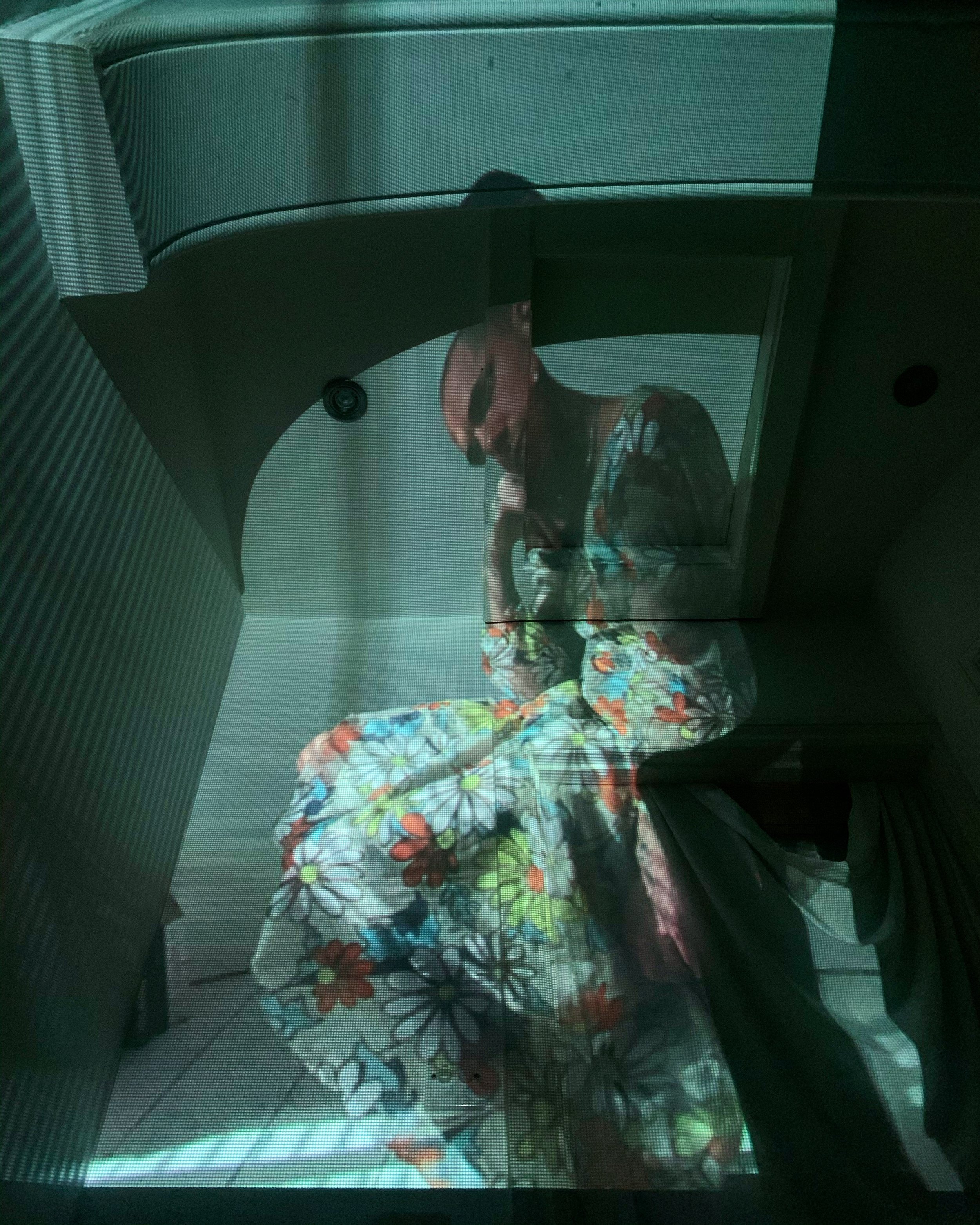 Person sitting with colorful floral projection on them, in a dimly lit room with geometric patterns on the walls.