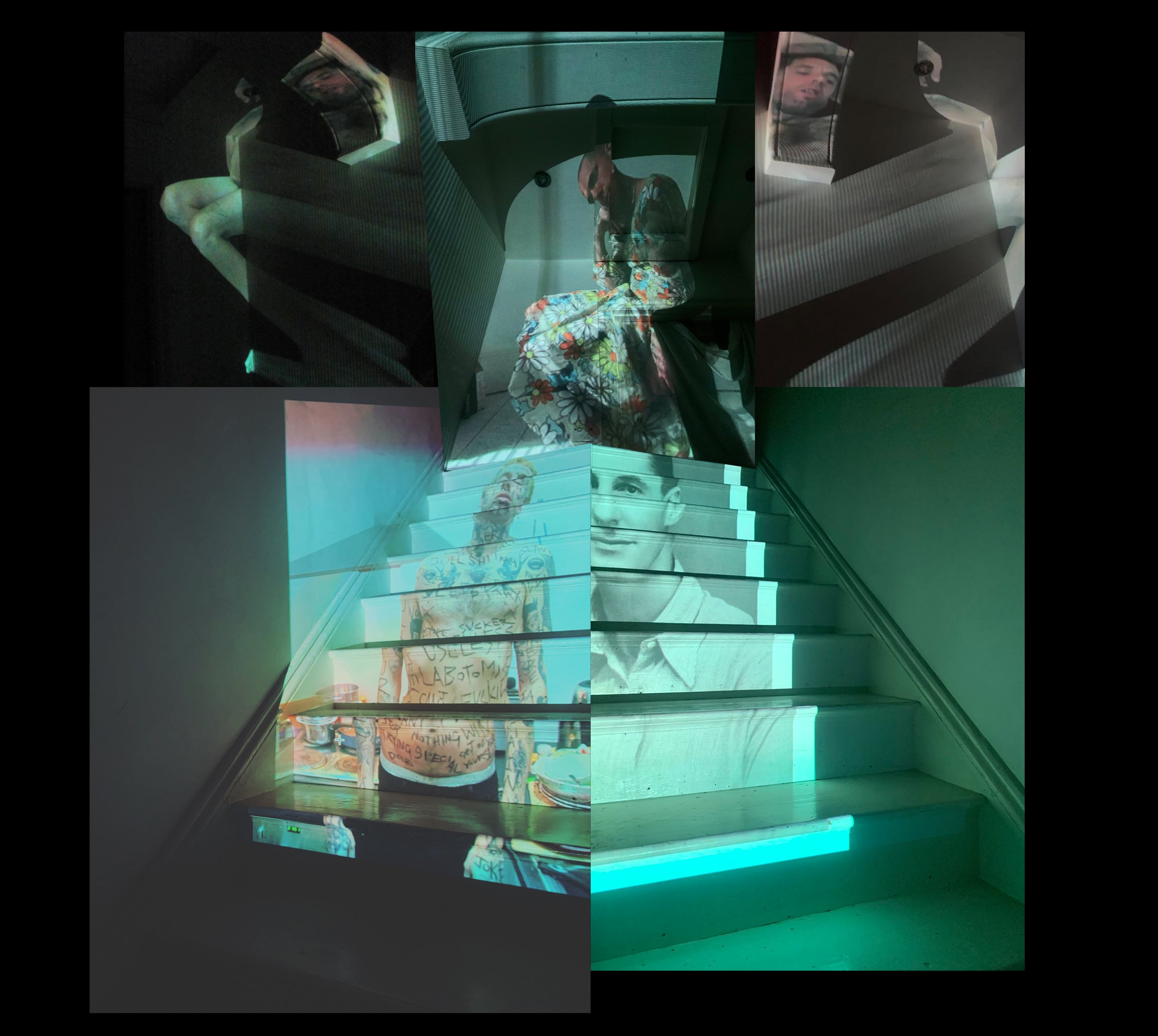 Collage of images projected onto stairs and walls, featuring portraits and artistic visuals.