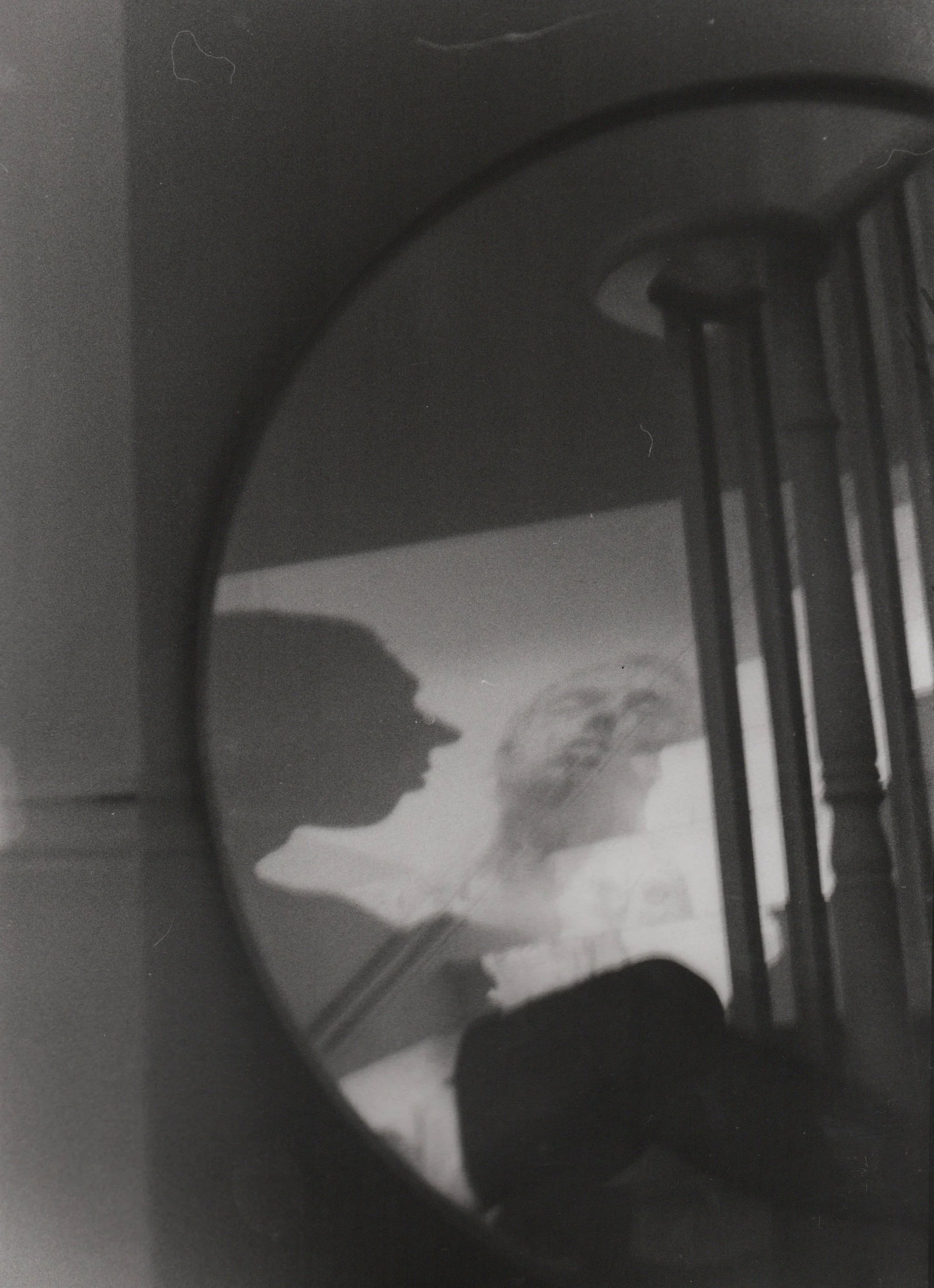 Abstract black and white photo of a distorted reflection in a round mirror, showing a person and staircase.